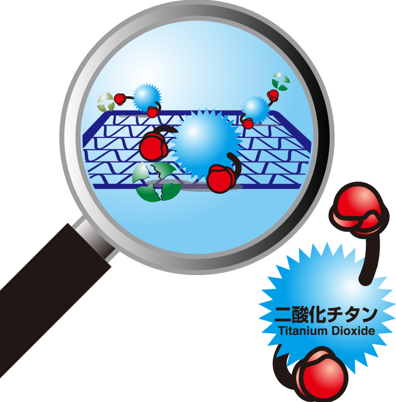 光触媒(二酸化チタン)は光のエネルギーを使って働く触媒です。光エネルギーを化学エネルギーに変換したり、環境を汚染する物質や悪臭の除去、汚れの防止などに使われています。