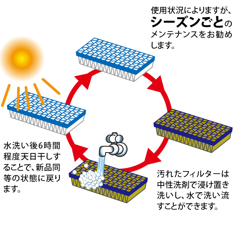 シーズンごとに水洗いと天日干しを繰り返すことで、効果を持続することができます。地球環境にも優しいエコタイプのエアフィルターです。