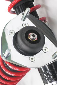 スチールアッパーマウントを採用しています。(一部車種は純正アッパーを再使用) ピロボール仕様はダイレクト感が増すものの作動音や振動が起こりやすいためにこれに匹敵する強靭なスチール材とし、専用ゴムブッシュマウントを採用しました。